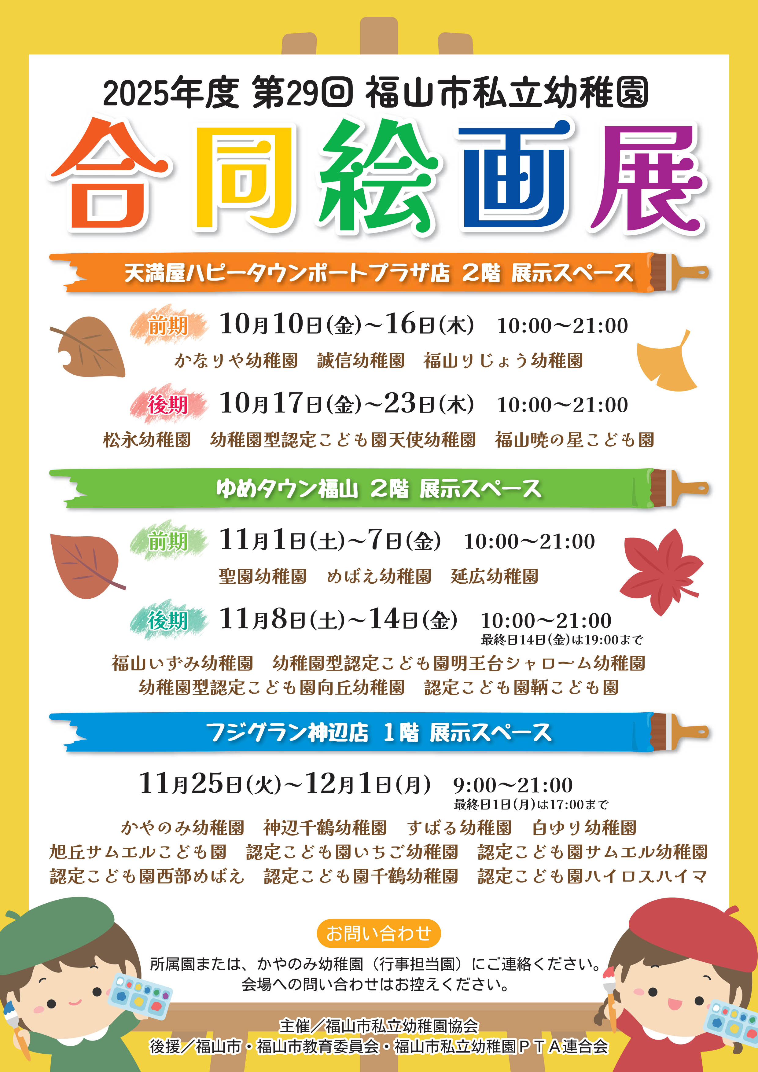 令和7年度、下記の日程にて絵画展を開催いたします。 ➀天満屋ハピータウンポートプラザ店 2階展示スペース 【前期】 令和7年10月10日(金)~10月16日(木) 【後期】 令和7年10月17日(金)~10月23日(木) ②フジグラン神辺店 1階展示スペース 【前期】 令和7年11月1日(土)~11月7日(金) 【後期】 令和7年11月8日(土)~11月14日(金) 多くの方のご来場をお待ちしております。